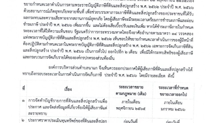 เรื่อง การขยายกำหนดเวลาดำเนินการตาม พรบ.ภาษีที่ดินและสิ่งปลูกสร้าง พ.ศ.2562 ประจำปี พ.ศ.2566