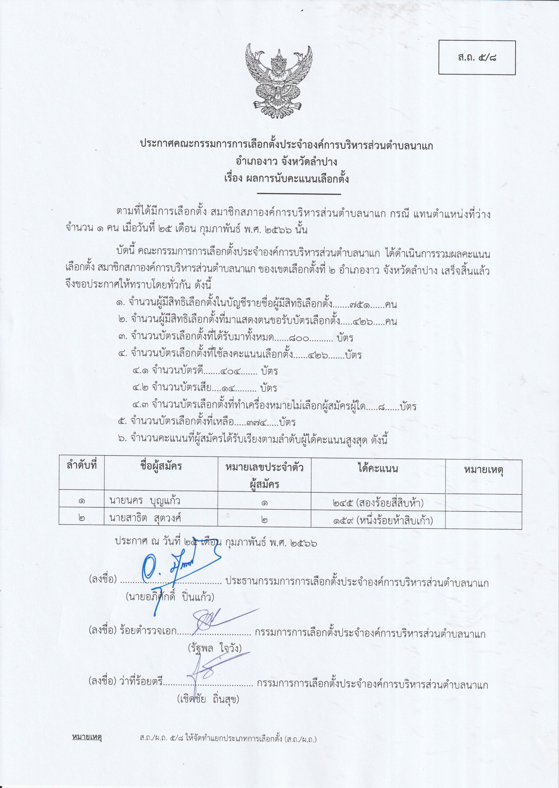 ประกาศคณะกรรมการการเลือกตั้งประจำองค์การบริหารส่วนตำบลนาแก อำเภองาว จังหวัดลำปาง เรื่อง ผลการนับคะแนนเลือกตั้งสมาชิกสภาองค์การบริหารส่วนตำบลนาแก กรณี แทนตำแหน่งที่ว่าง 0 Share FacebookTwitterGoogle+ReddItWhatsAppPinterestEmail