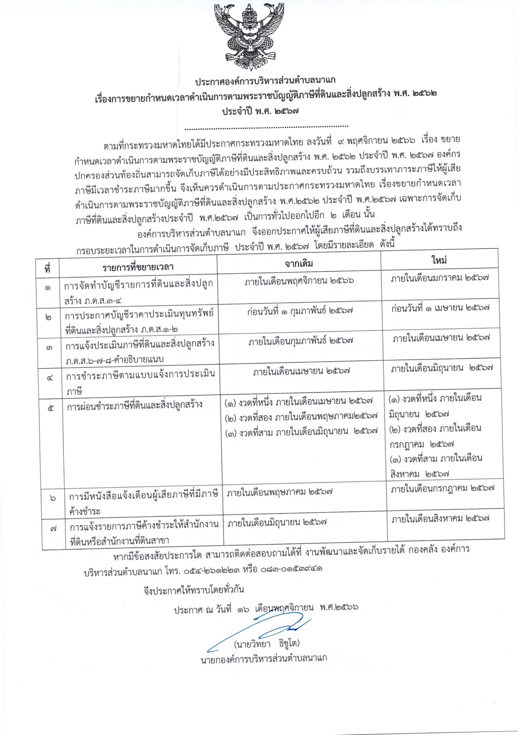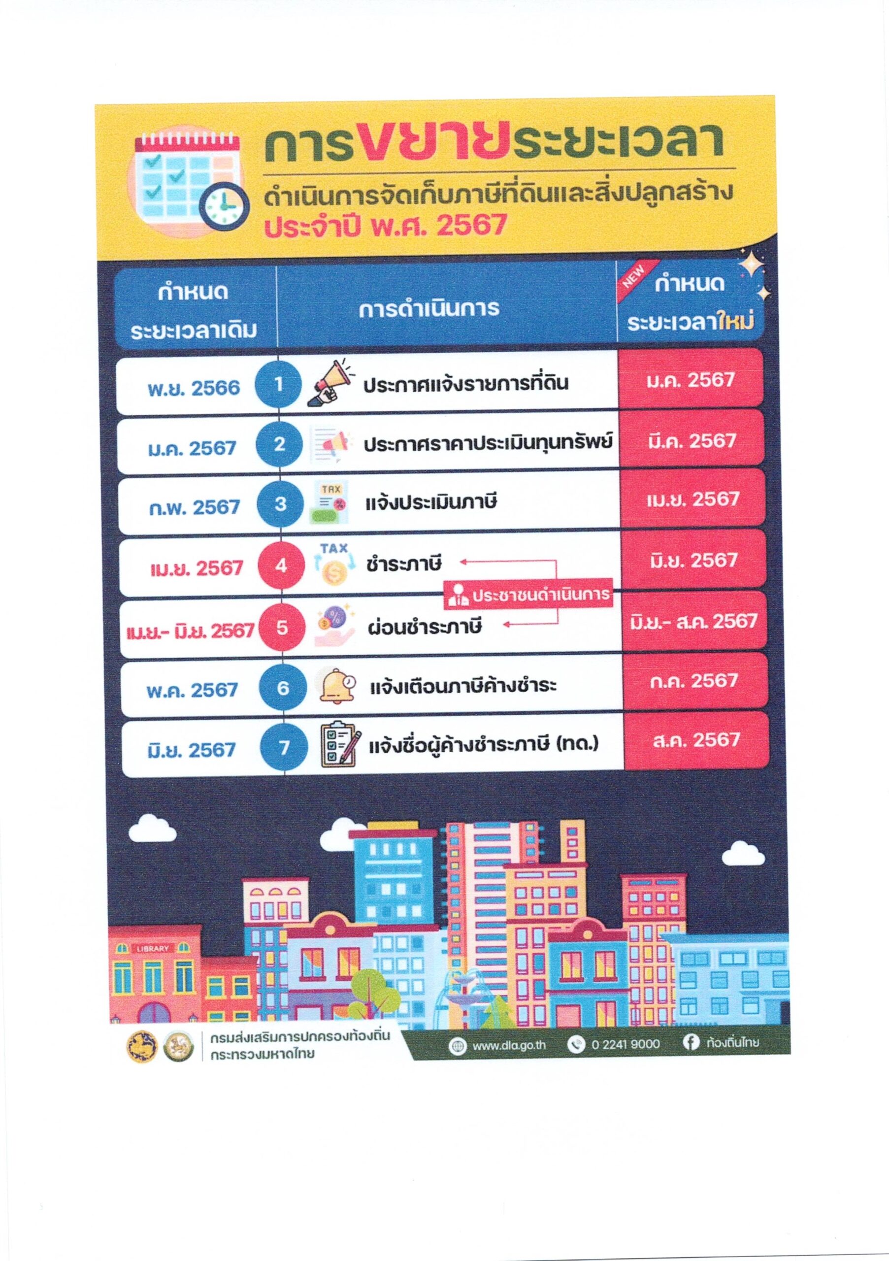ประกาศ ขยายกำหนดเวลาดำเนินการตาม พ.ร.บ.ภาษีที่ดินและสิ่งปลูกสร้าง ประจำปี พ.ศ.2567