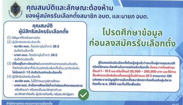 ประชาสัมพันธ์ “คุณสมบัติและลักษณะต้องห้ามของผู้สมัครรับเลือกตั้งสมาชิกสภาองค์การบริหารส่วนตำบล และนายกองค์การบริหารส่วนตำบล” 0 Share FacebookTwitterGoogle+ReddItWhatsAppPinterestEmail